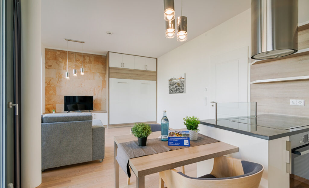 My v Residenz am Zwinger sledujeme zcela jiný cíl. Nabízíme vám plně zařízené apartmány, které obsahují vše, co potřebujete k bydlení a práci v jiném městě, a to na velké ploše. Nejmenší byty mají přitom velikost od 34 m² a jsou tak značně prostornější než hotelové pokoje.